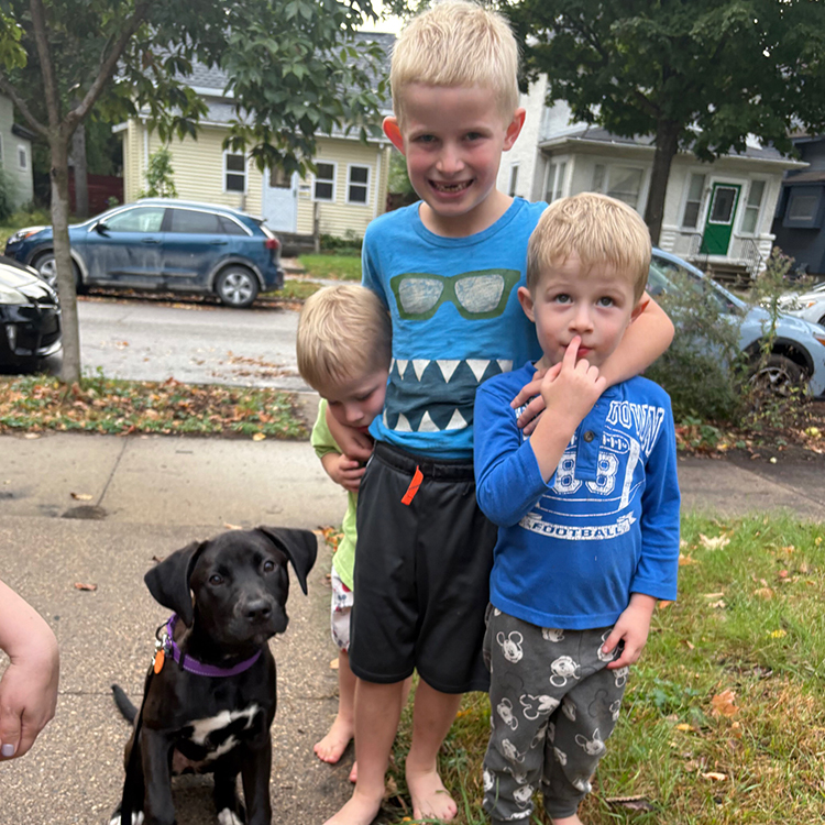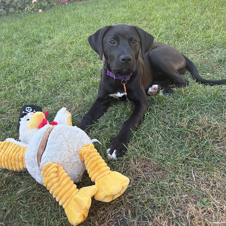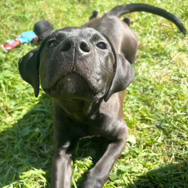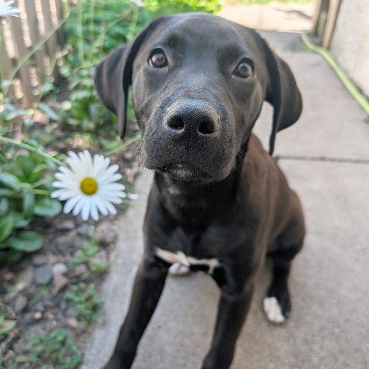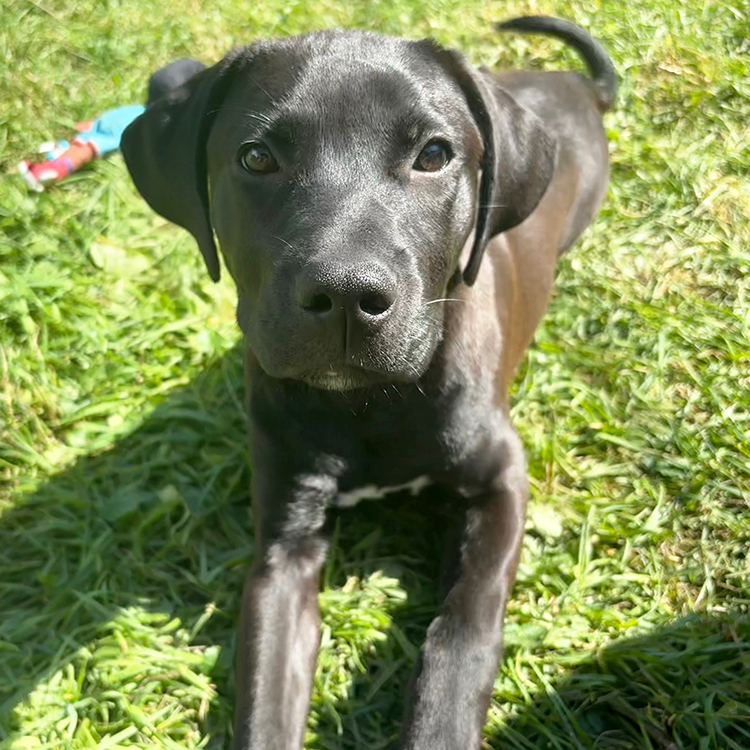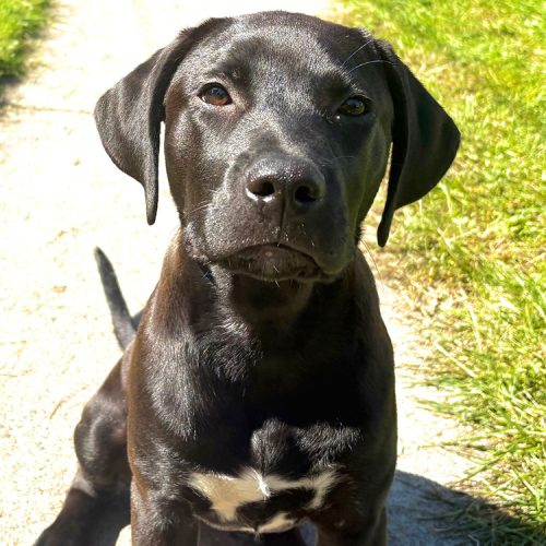 I’ve met a few kids and did great with them. Sometimes I bark at little humans, but it’s only because I’m so excited and want to play. I haven’t met any cats yet. At my foster home, I have a gentle 10-year-old lab mix (Kaylee) who plays with me in the yard. My foster family thinks I may have a high prey drive, since I try to chase squirrels and bunnies on our walks. I’m an assertive, playful pup who loves other dogs, especially wrestling with my foster sister Kaylee in the backyard.