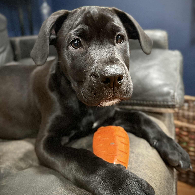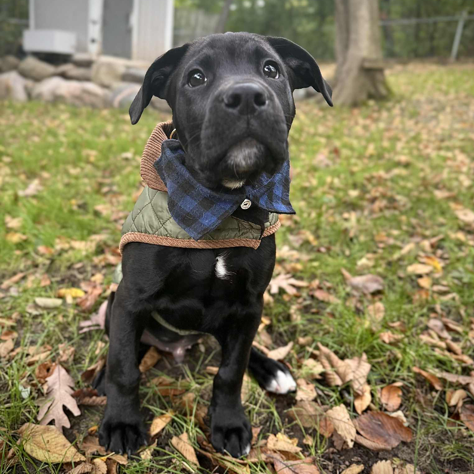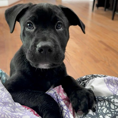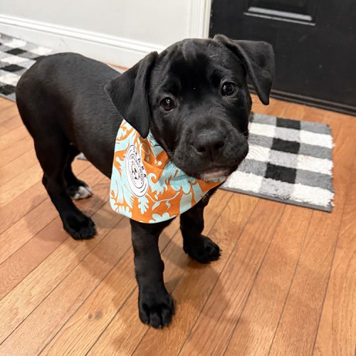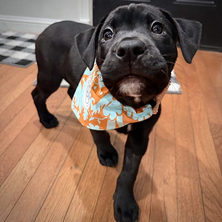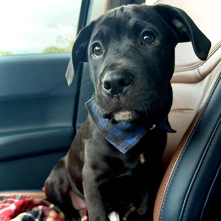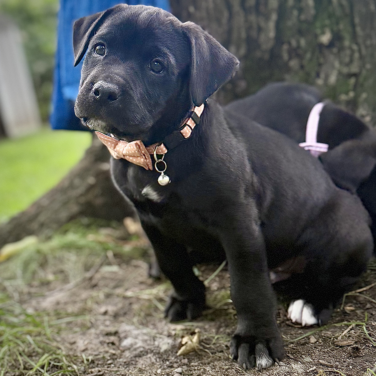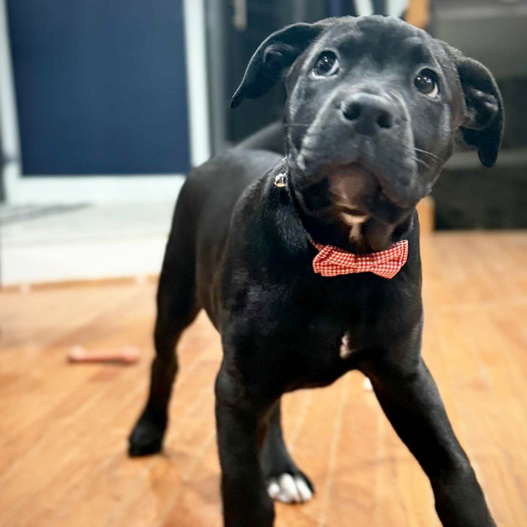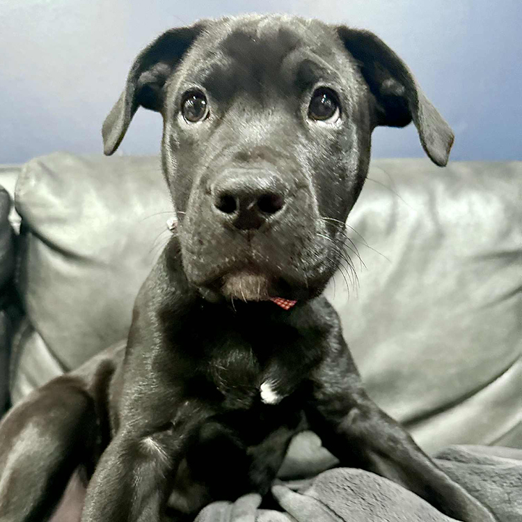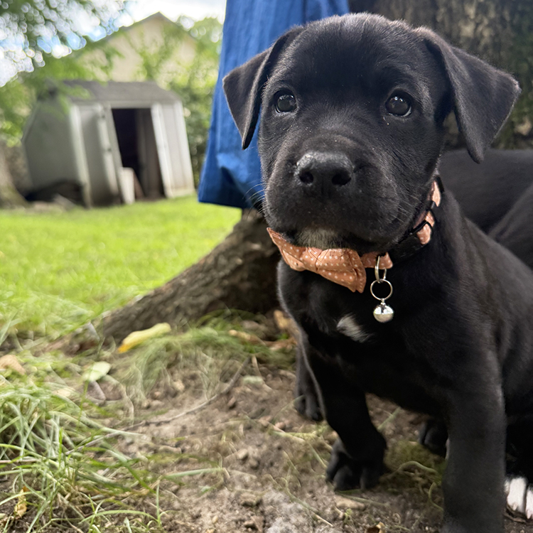 Hello, my name is Shark. I love my food and I have a healthy puppy bod to prove it! I’ve got three cute white toes on my back left paw and just the tip of a toe on the front left. I was five weeks old when I came into rescue. I’m part of a local litter of puppies who needed help finding new homes. There are seven of us and we all look identical!